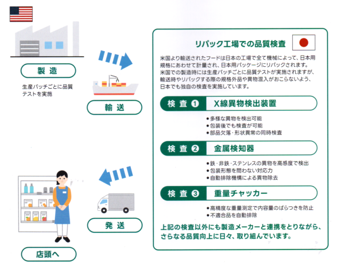 取り組みの1つとして、「製造国であるアメリカ」 と 「リパック地である日本」 において、それぞれ独自の品質テストを実施しています。
